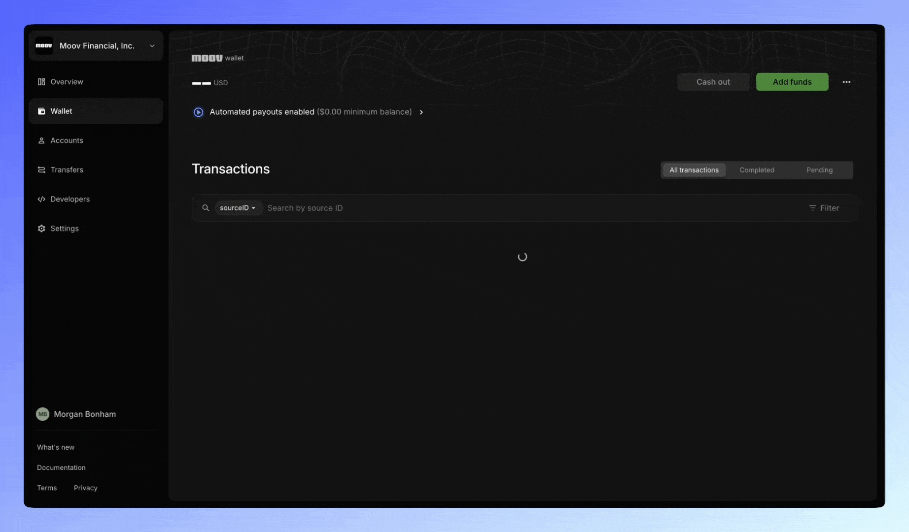 Every business using Moov has a Moov wallet. This functions similar to a bank account or PayPal balance. Customers can top-up their wallet, cash out, and use the funds to facilitate payments. Their wallet is also where they will collect fees on their merchants’ transfers (money movement).